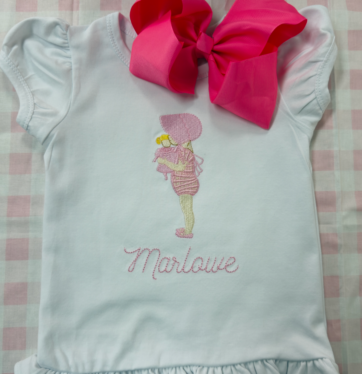 This sweet heirloom-style design features a delicate embroidered baby girl motif in soft blush and cream tones, stitched with a timeless, vintage feel. The design is paired with elegant script embroidery, making it both charming and meaningful.